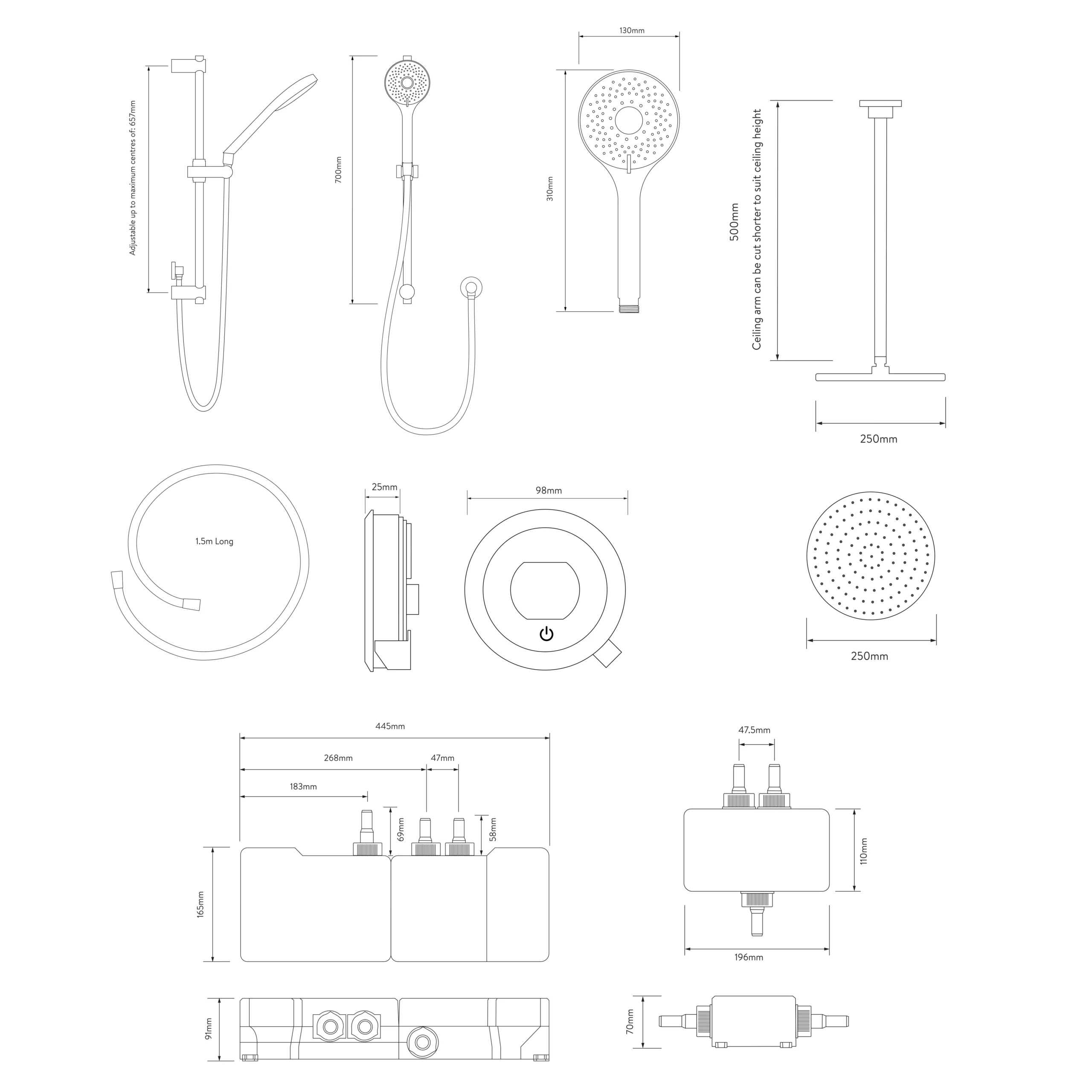 - Included: 130mm adjustable head, 250mm fixed head, ceiling arm, riser rail, Optic Q Smart controller, push button holder, gel hanger, 1.5m hose, Divert SmartValve™, fixtures and fittings