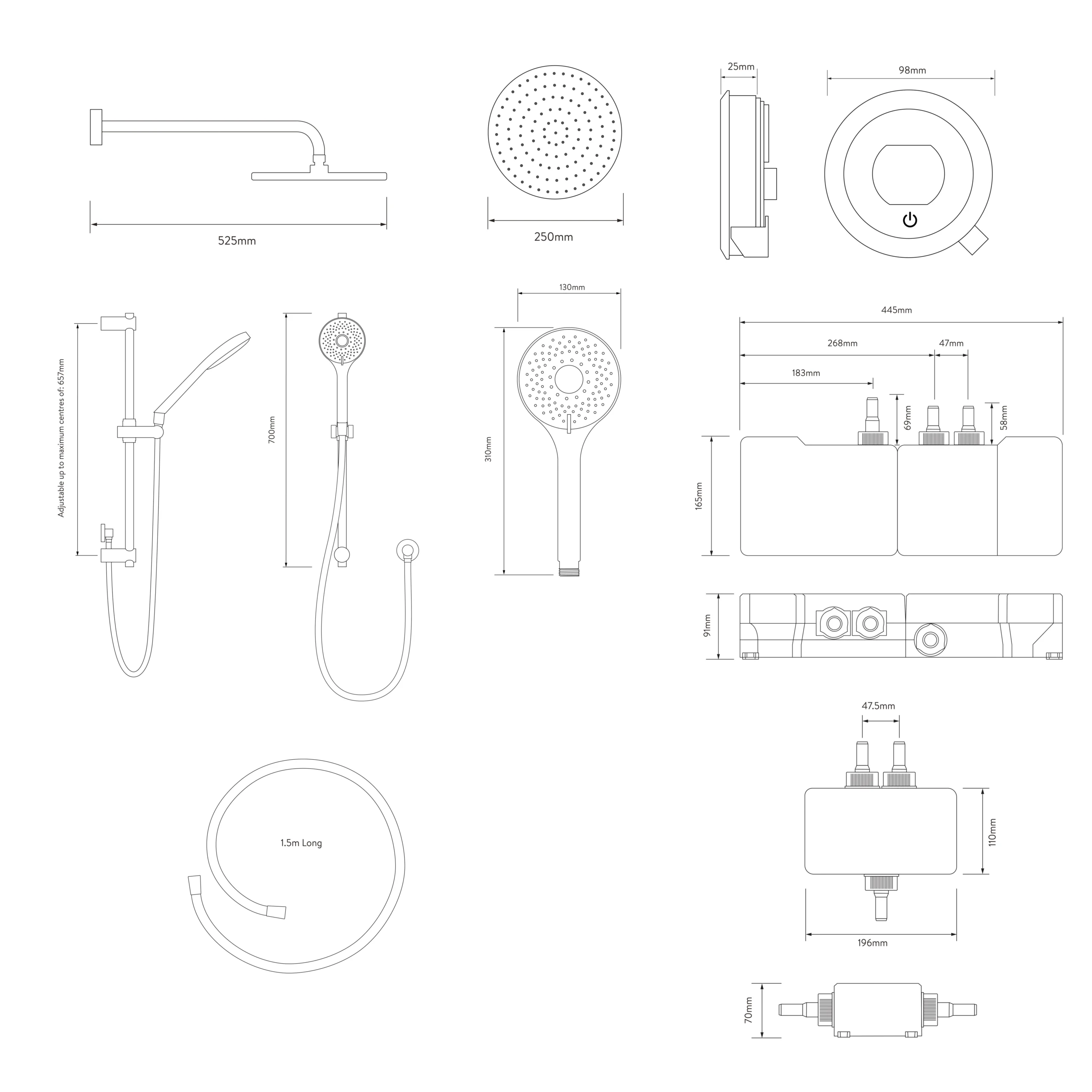 - Included: 130mm adjustable head, 250mm fixed head, wall arm, riser rail, Optic Q Smart controller, push button holder, gel hanger, 1.5m hose, Divert SmartValve™, fixtures and fittings