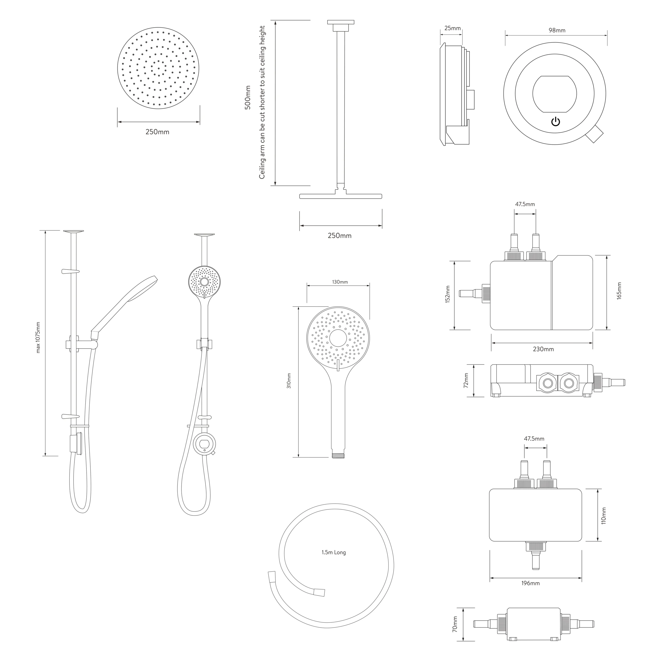 - Included: 130mm adjustable head, 250mm fixed head, ceiling arm, exposed riser rail, Optic Q Smart controller, push button holder, gel hanger, 1.5m hose, Divert SmartValve™, fixtures and fittings