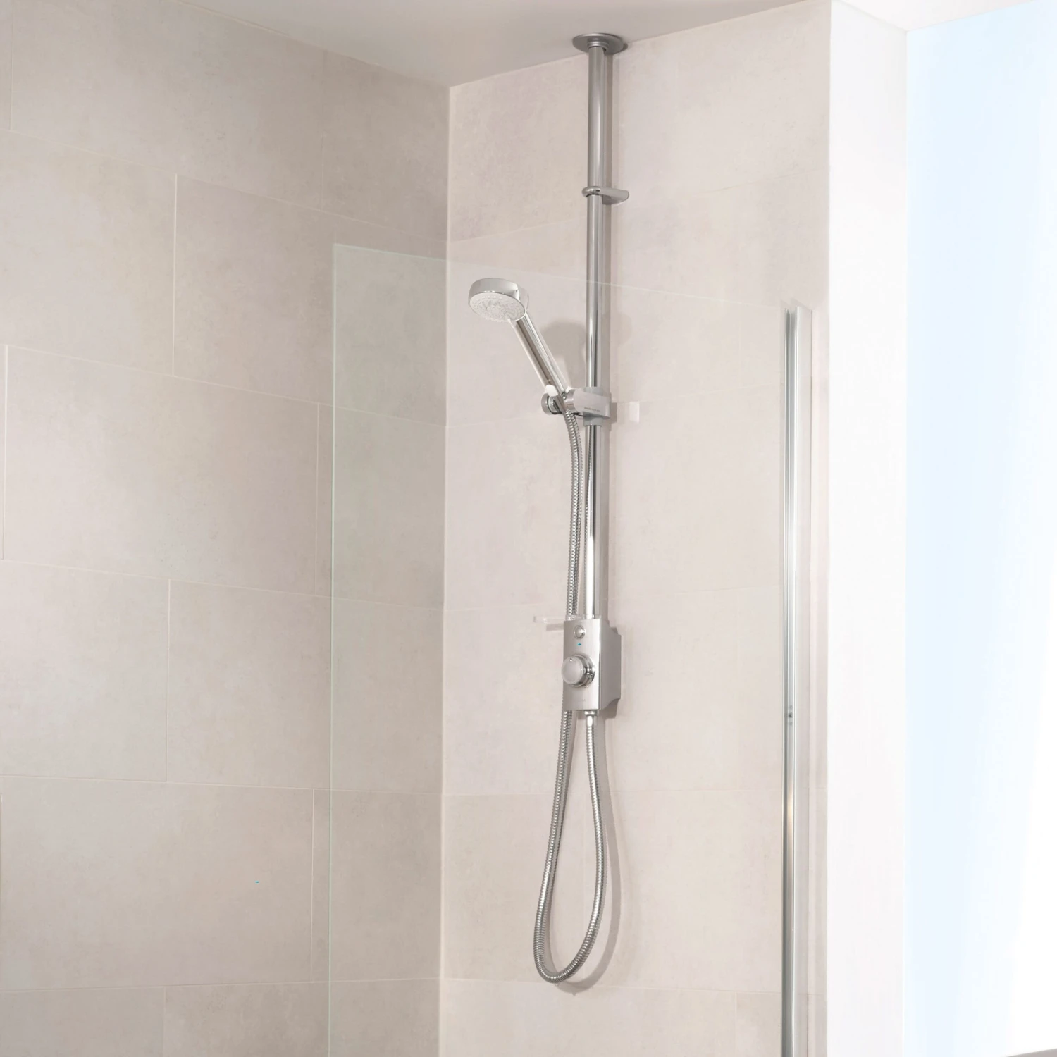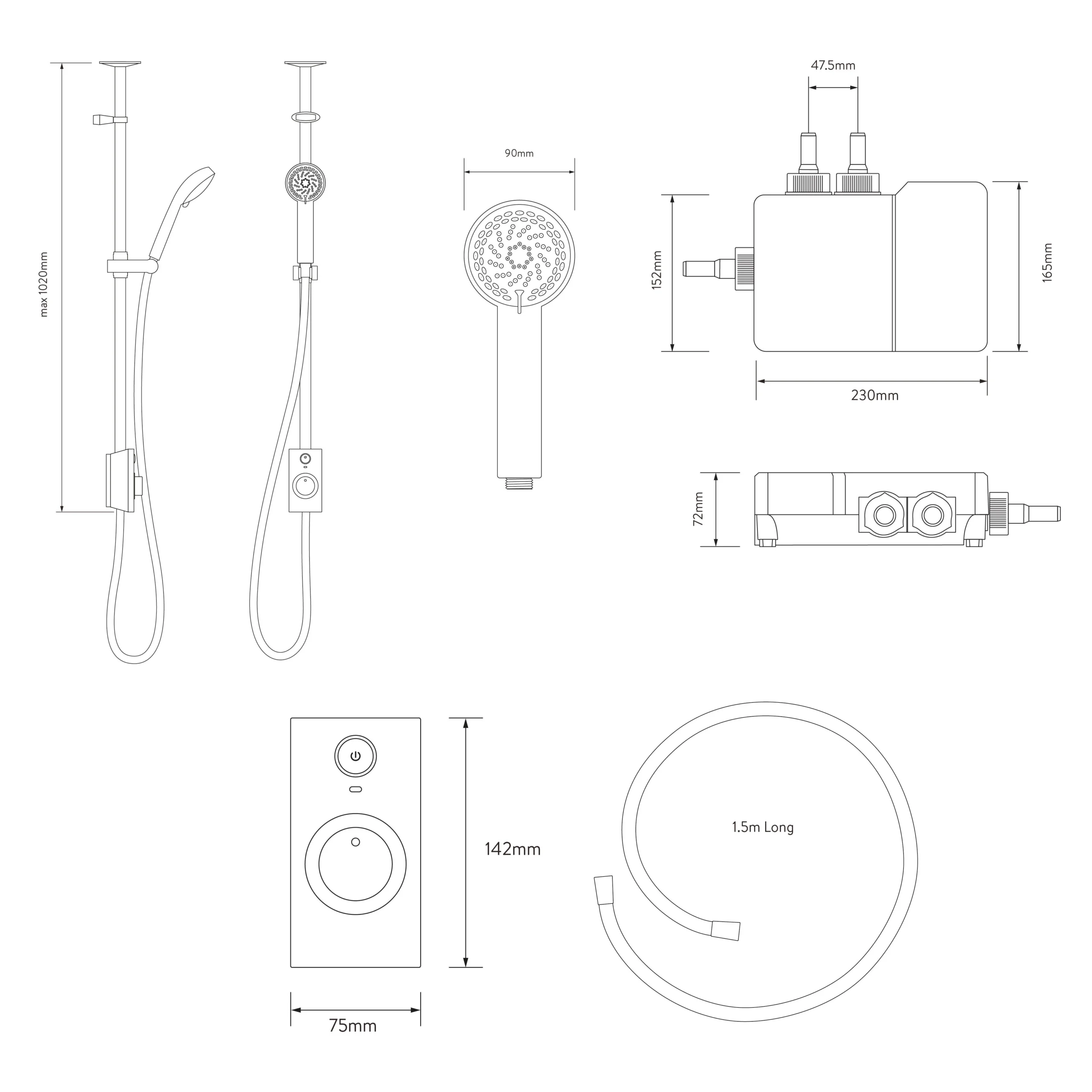 - Included – Controller, 90mm adjustable head, SmartValve, exposed riser rail, pinch grip slider, gel hanger, 1.5m hose, fixtures and fittings