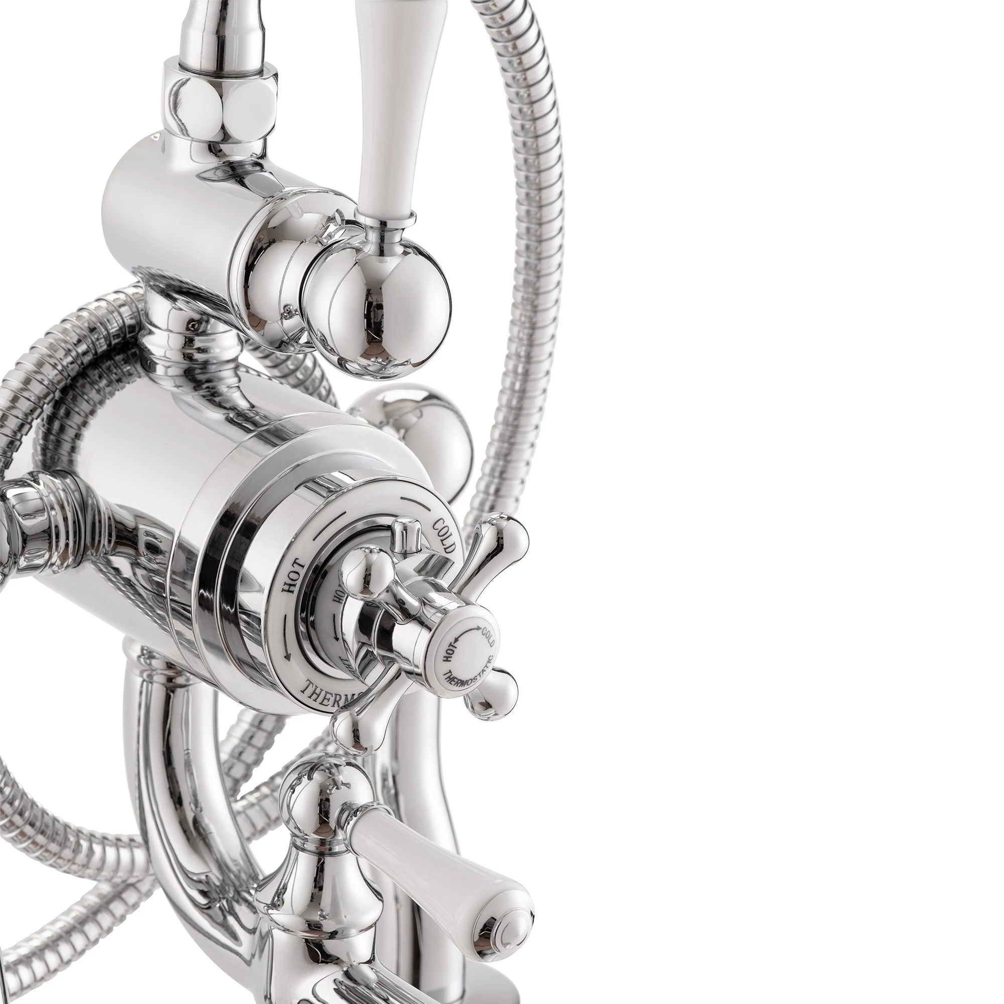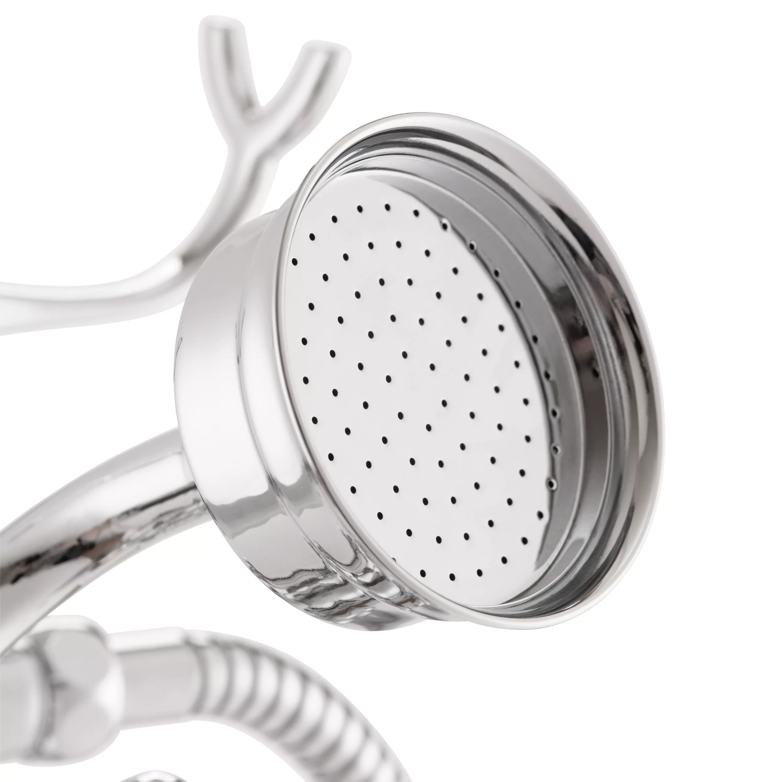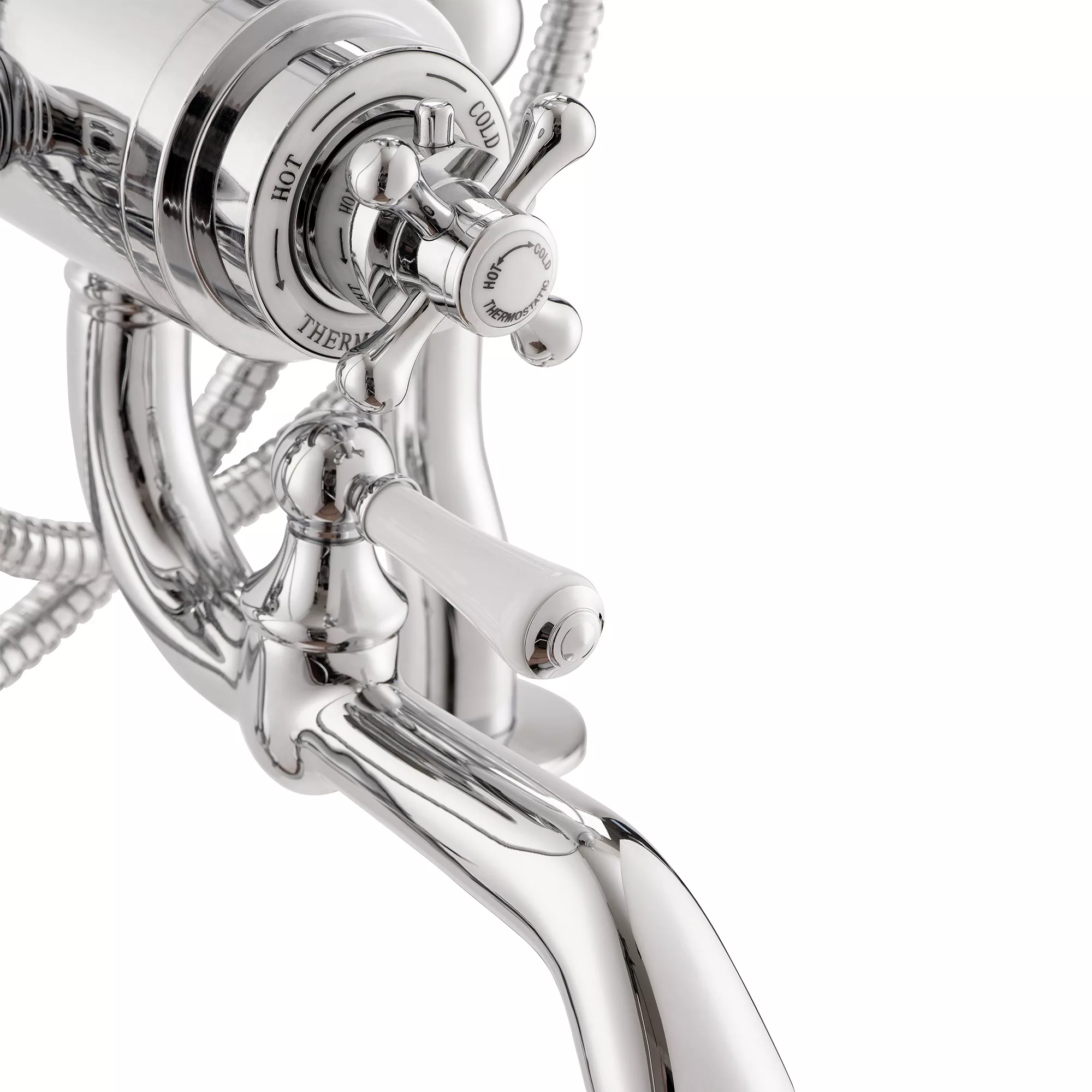 Arroll’s Traditional Chrome Bath Shower Mixer with Ceramic Lever Handles + Shower Kit will complete your bath, suitable for any Arroll baths with tap holes. This easy–to–install set is manufactured from solid brass with a hard–wearing chrome finish and is intended for baths with two tap holes. It has an elegant spout design and classic ceramic lever handles for the bath taps. The telephone handset is ceramic adding to this stunning set.