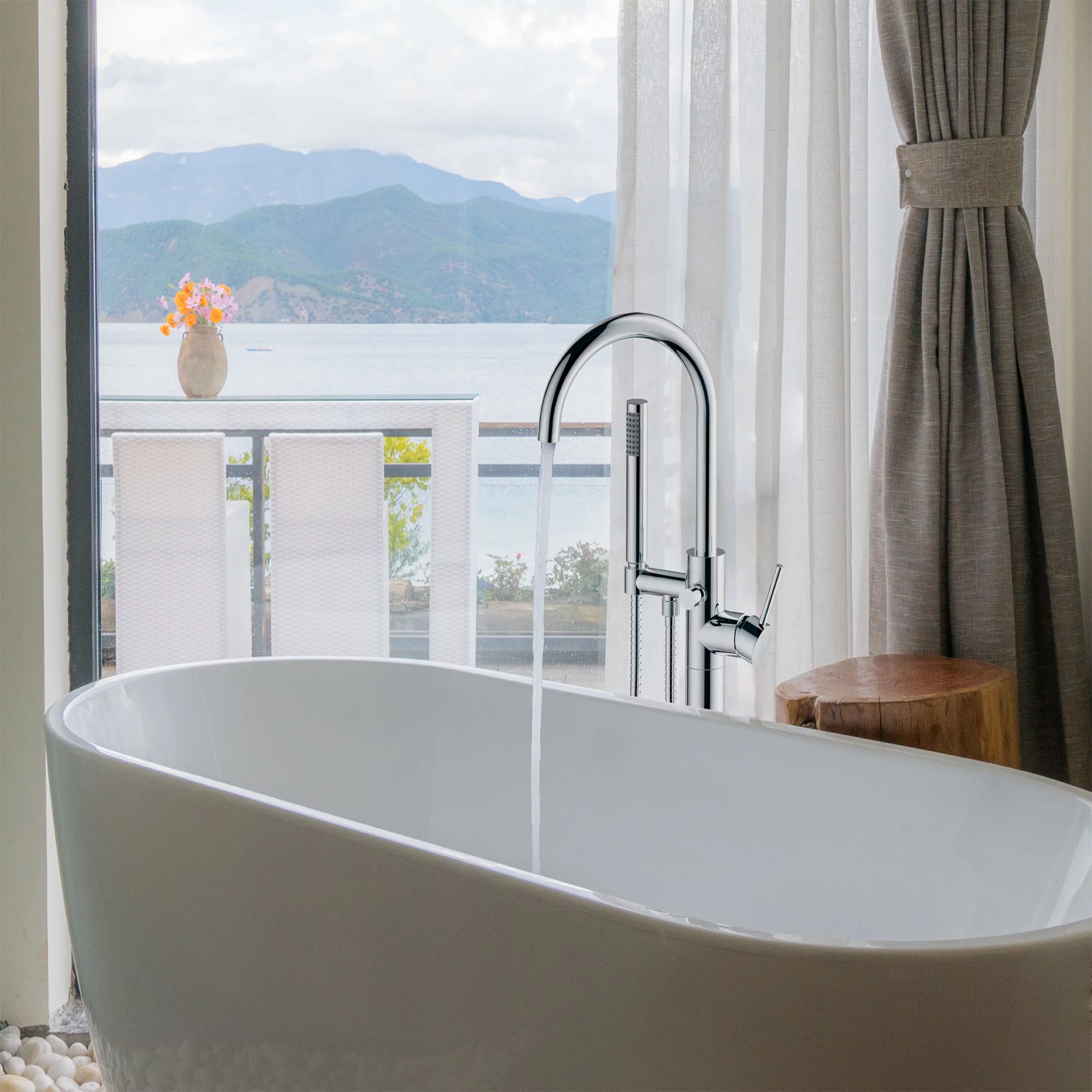 - This round tall freestanding bath shower mixer is suitable for baths without tap holes