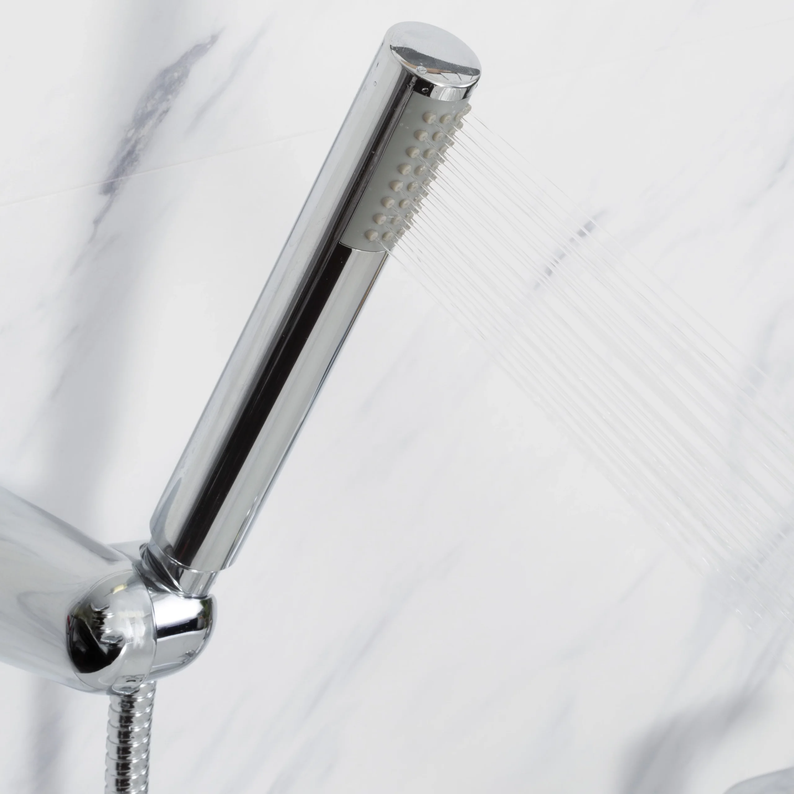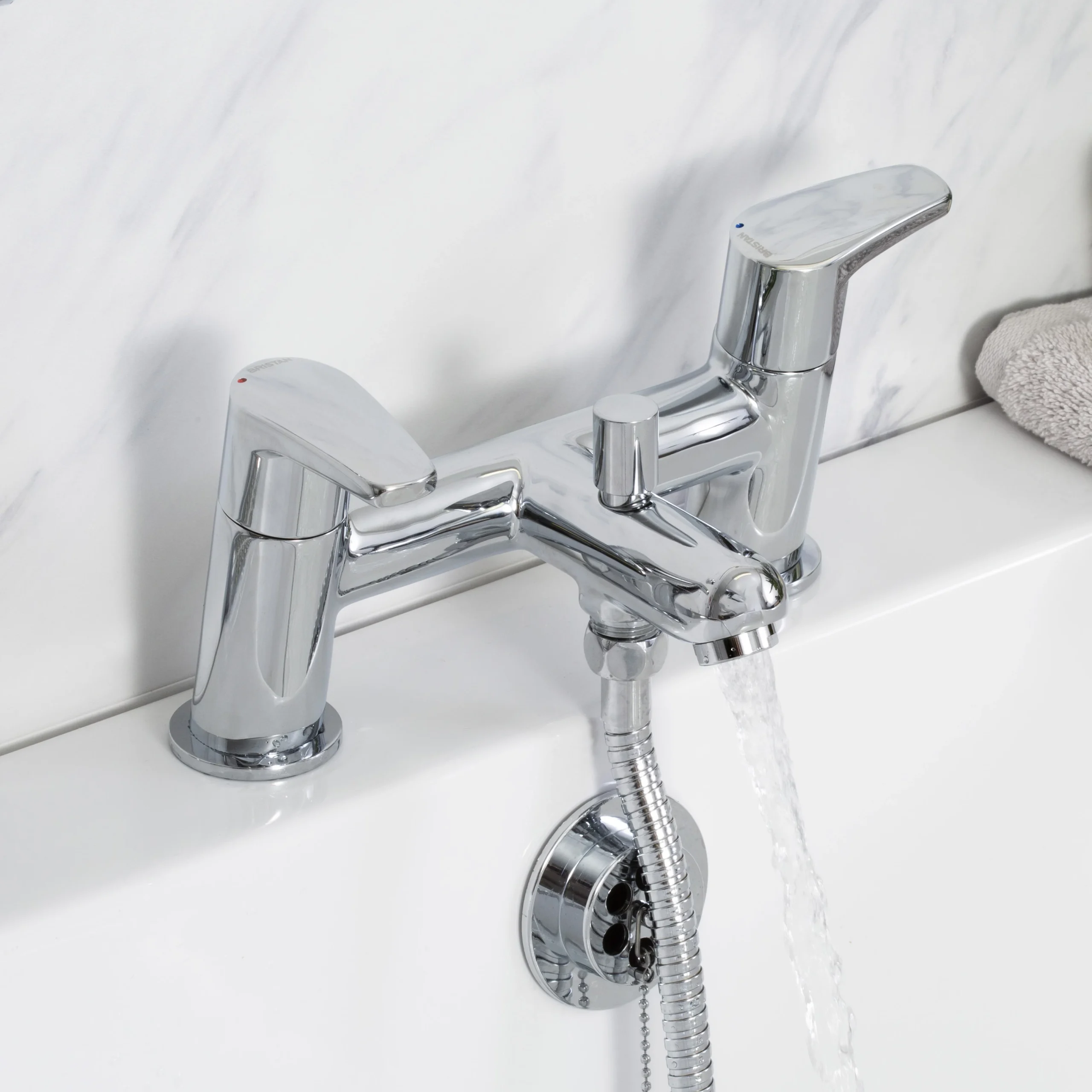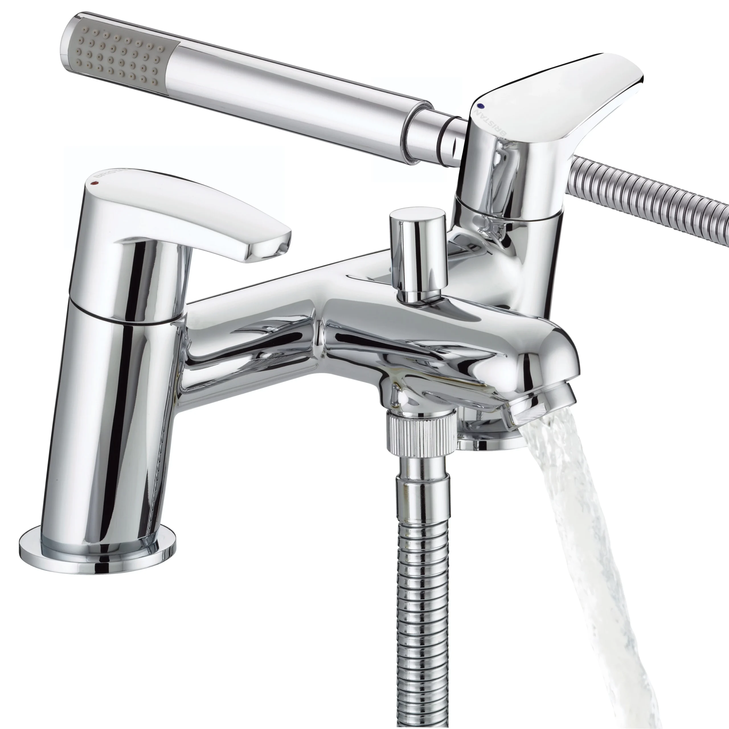 - Comes with 1x Tap, 2x Plinths, 2x O-Rings, 2x Washers, 2x Back Nuts, 1x Hose, 1x Handset, 1x Handset Holder, 2x Screws, 2x Rawl Plugs, 1x Fitting Instructions