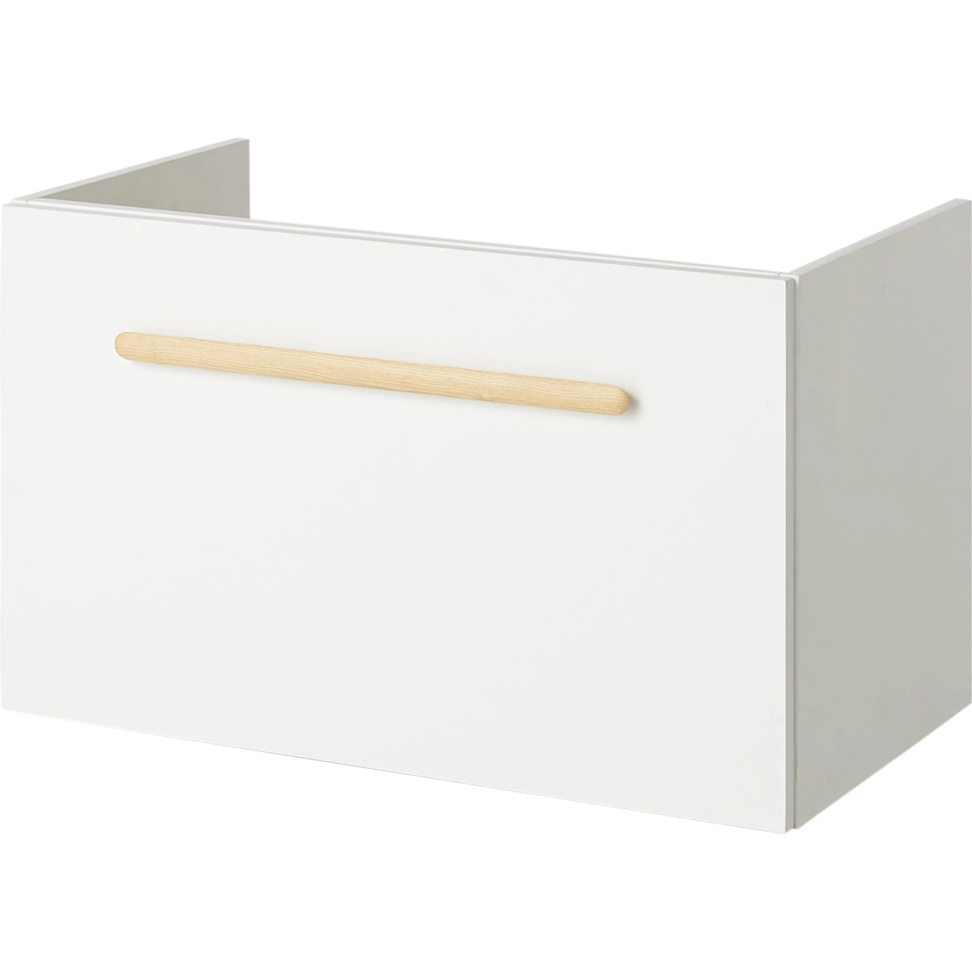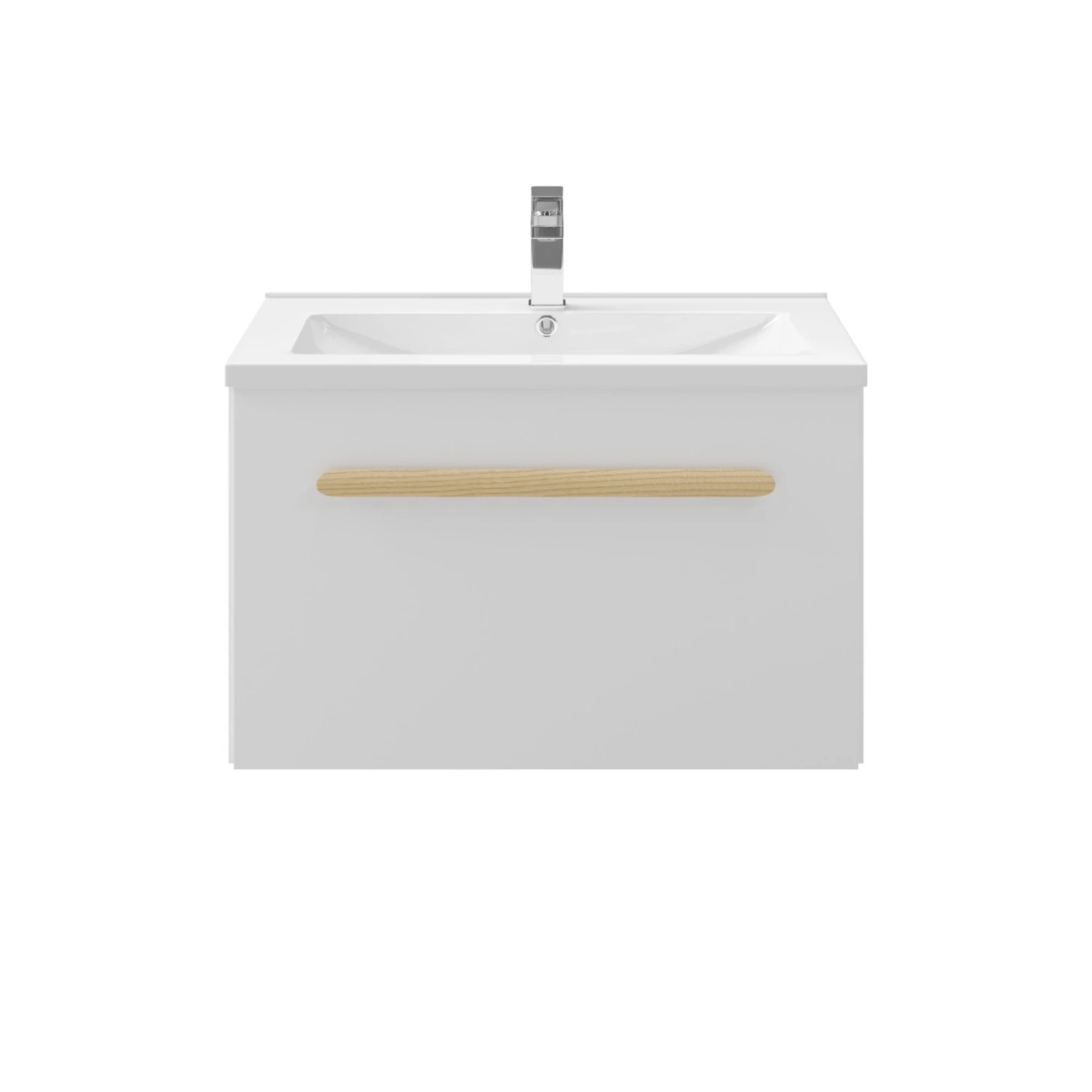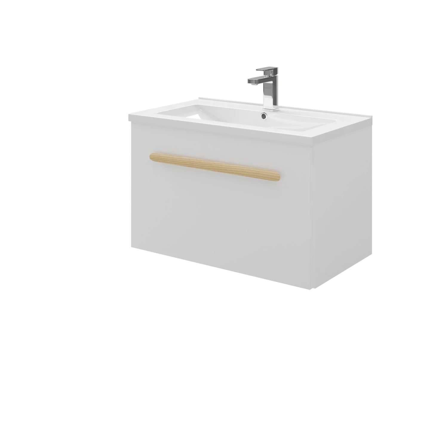 This Adriska white vanity basin unit is ideal for maximising the space in your bathroom, the single soft close drawer is deep enough to hold your bathroom essentials and helps to keep your bathroom clutter free. The minimalist and elegant white finish unit has a natural wood handle which will fit with any bathroom décor, perfect for creating a minimalist and elegant feel to any bathroom.