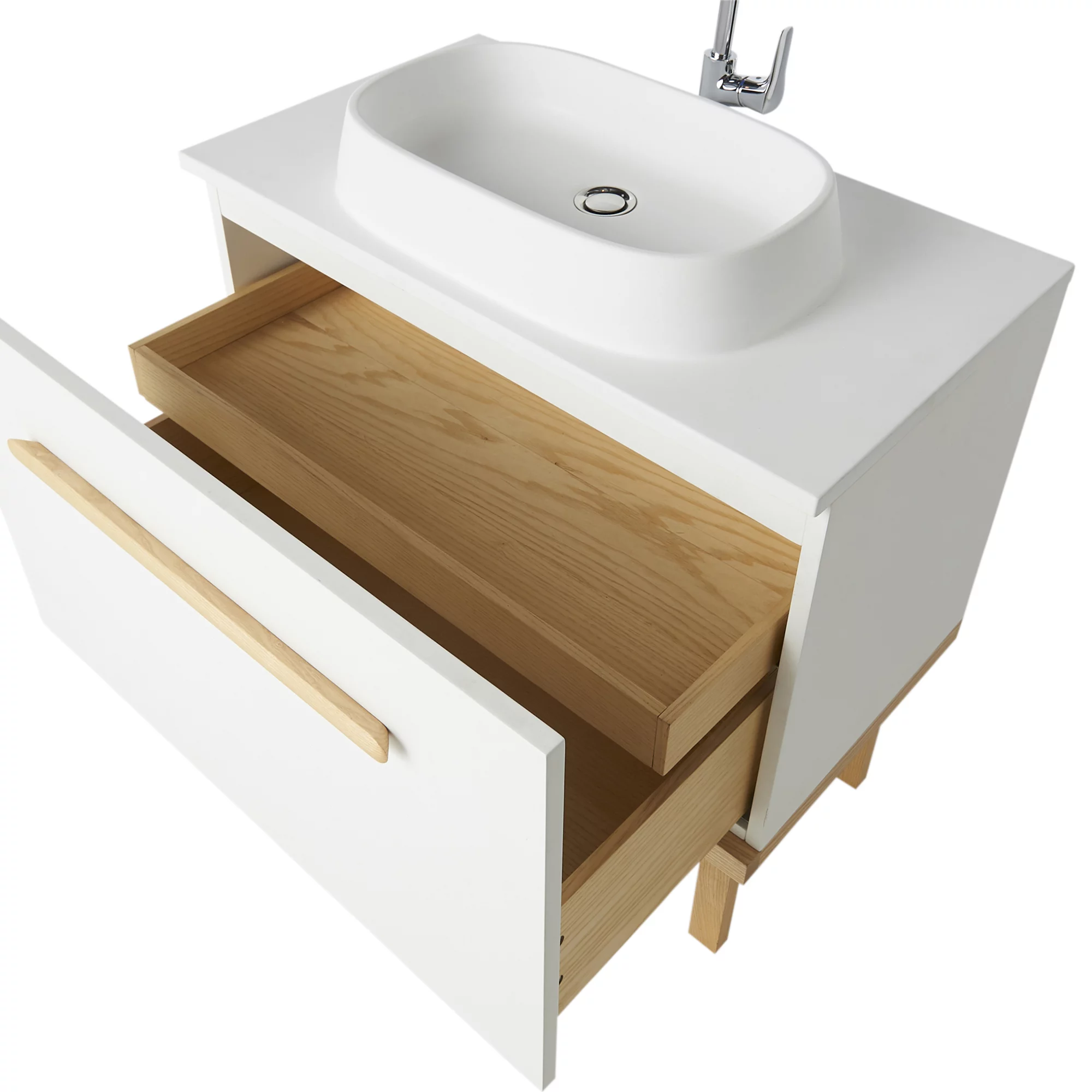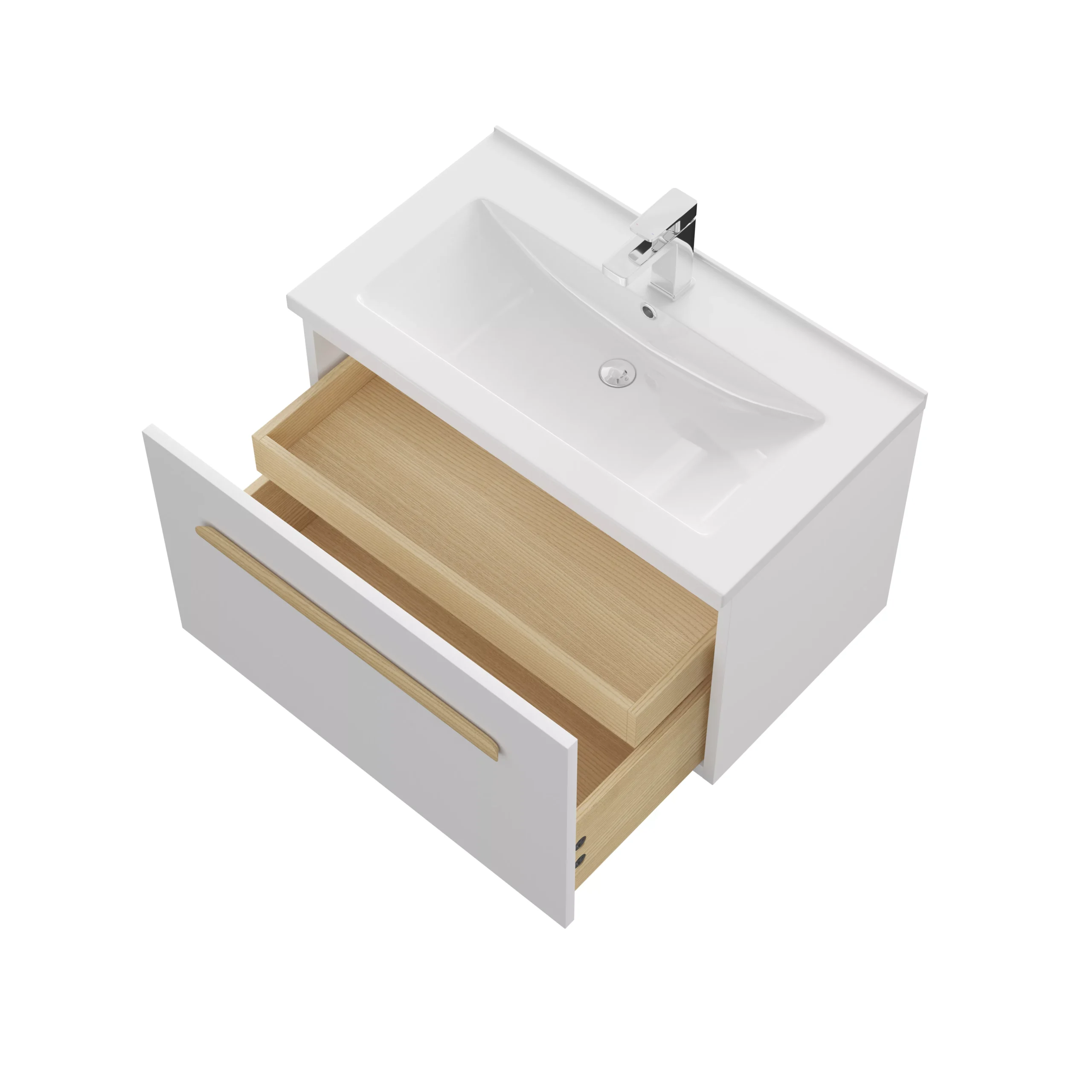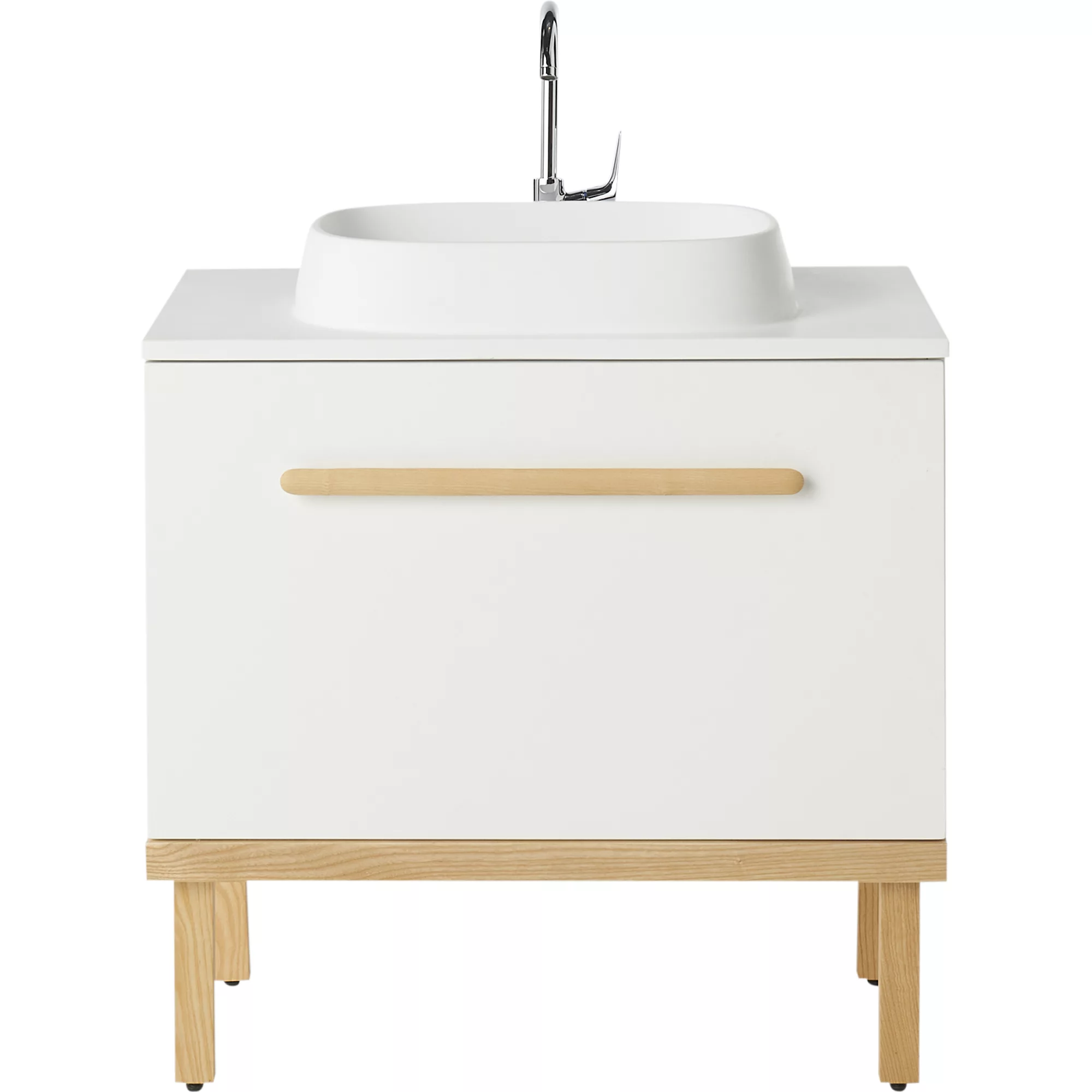 This Adriska white vanity basin unit is ideal for maximising the space in your bathroom, the single soft close drawer is deep enough to hold your bathroom essentials and helps to keep your bathroom clutter free. The minimalist and elegant white finish unit has a natural wood handle which will fit with any bathroom décor, perfect for creating a minimalist and elegant feel to any bathroom.