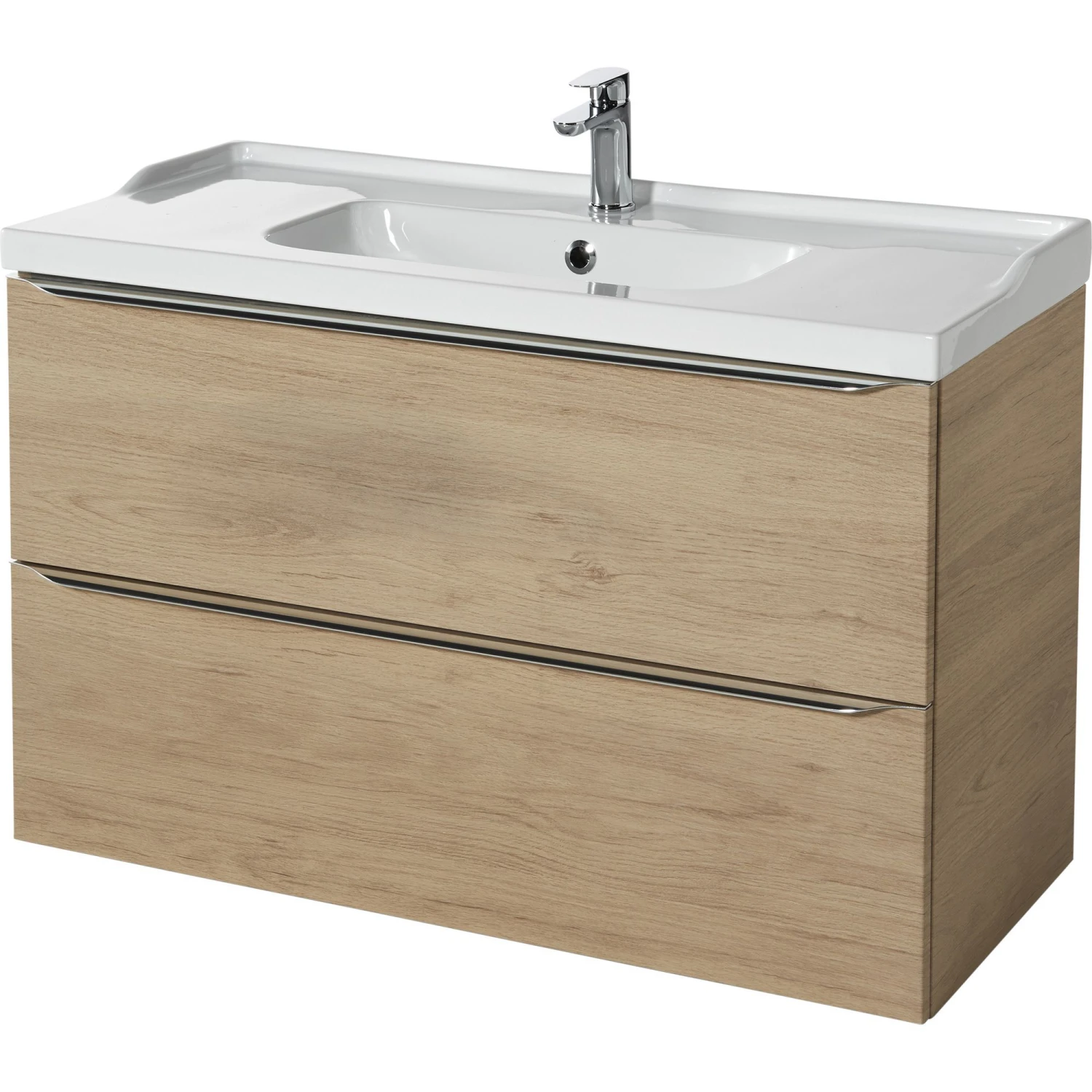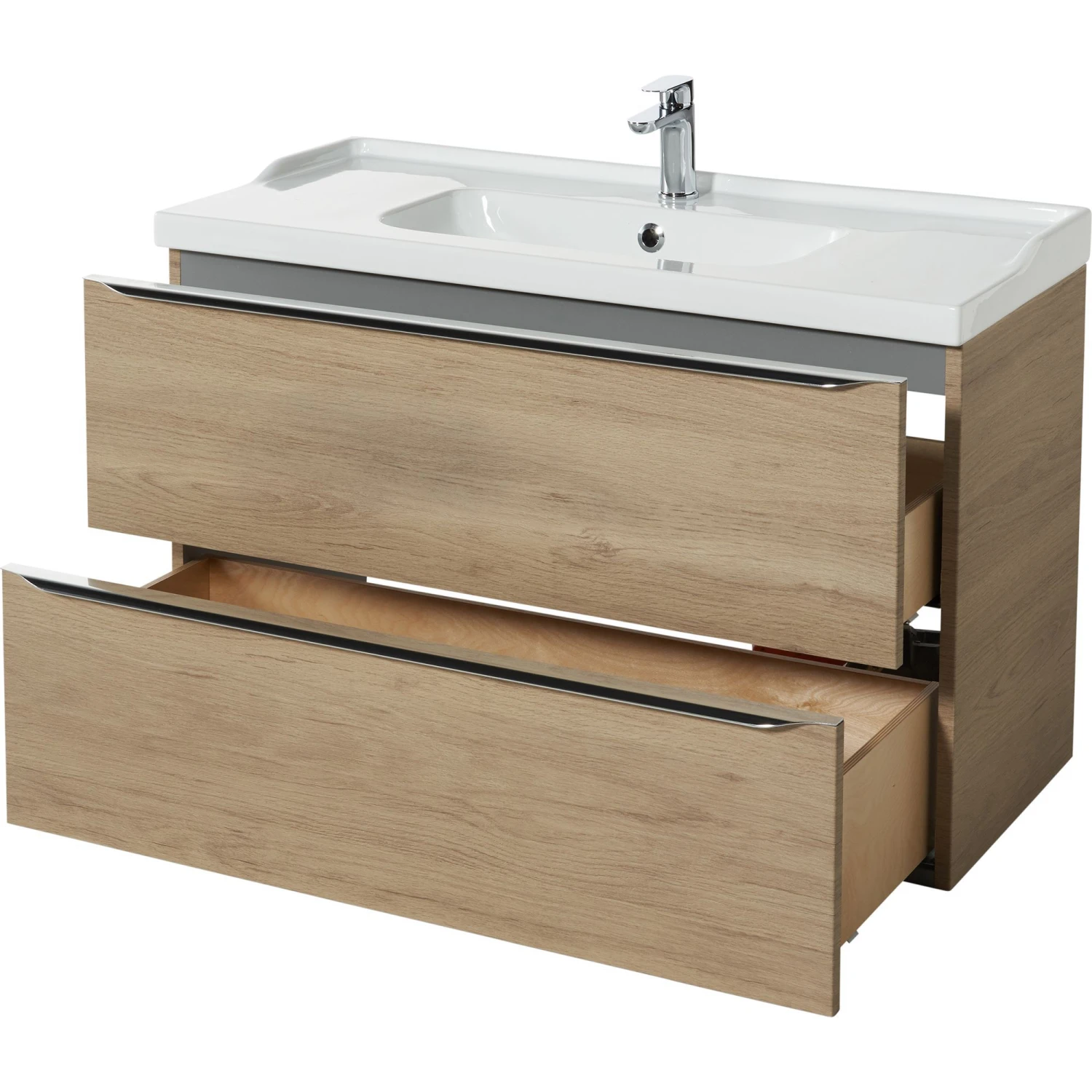 Bathrooms can be busy, cluttered spaces. So, we’ve designed the Imandra range – a smart modular furniture solution that fits any size, maximises storage and is built to last. This set comes with the oak effect Imandra vanity unit and Lana basin.