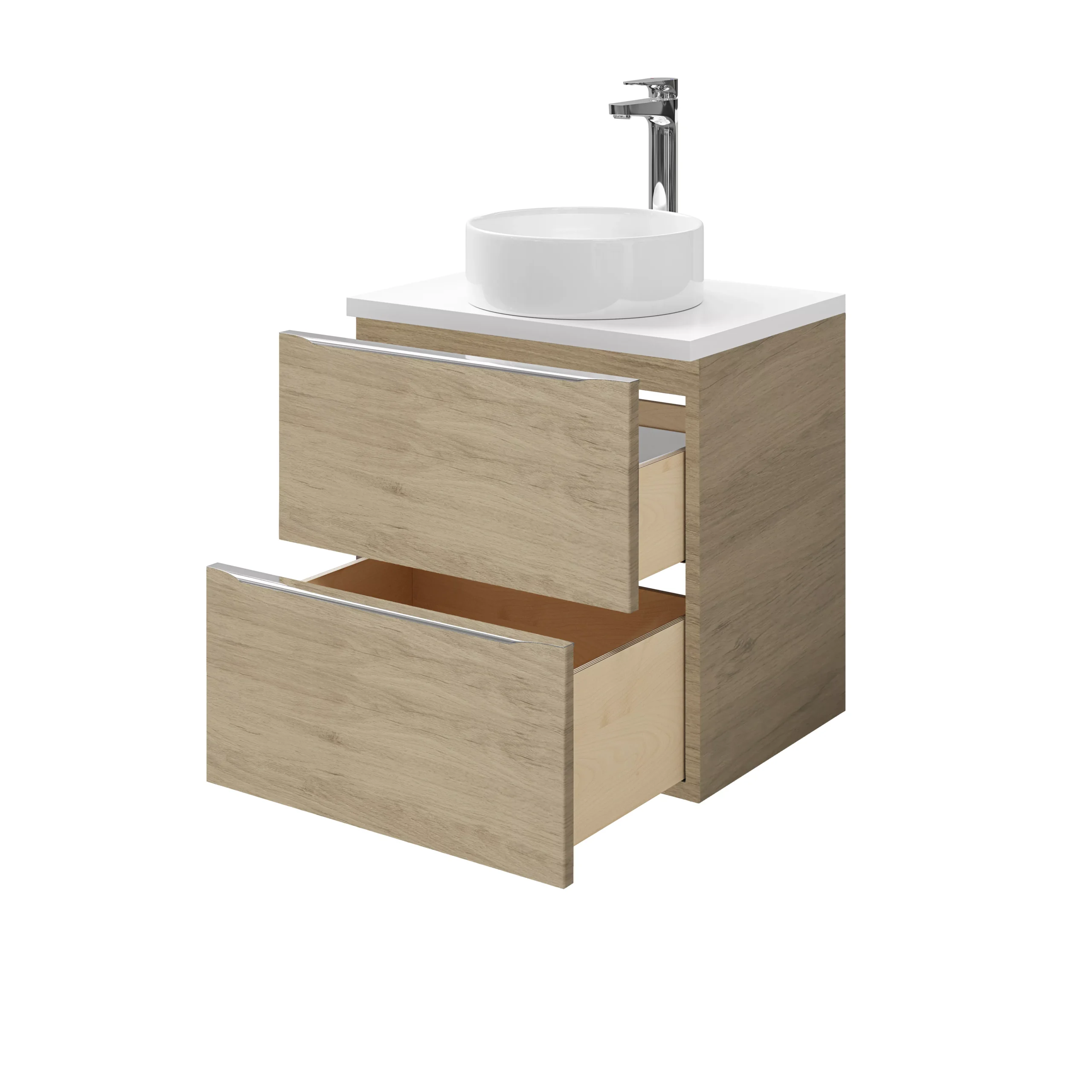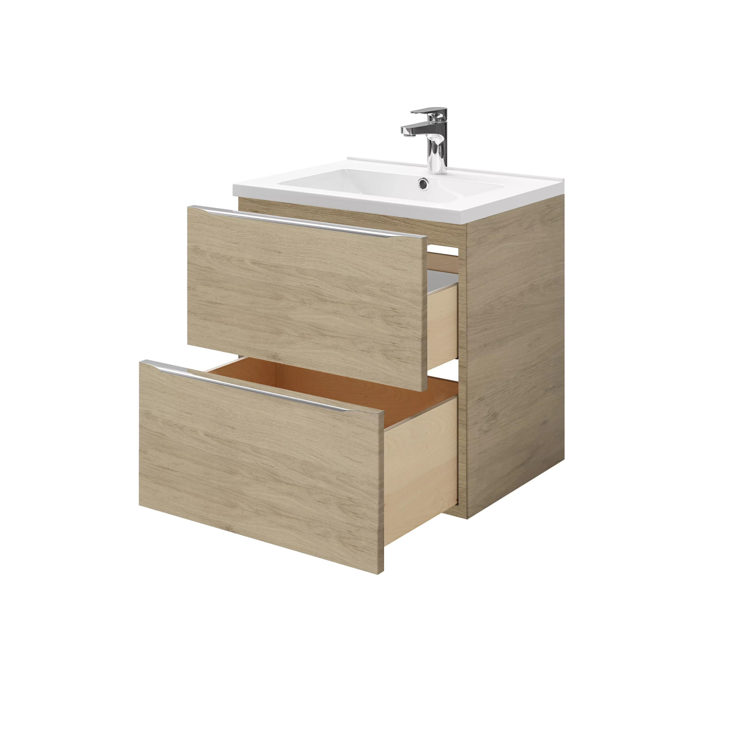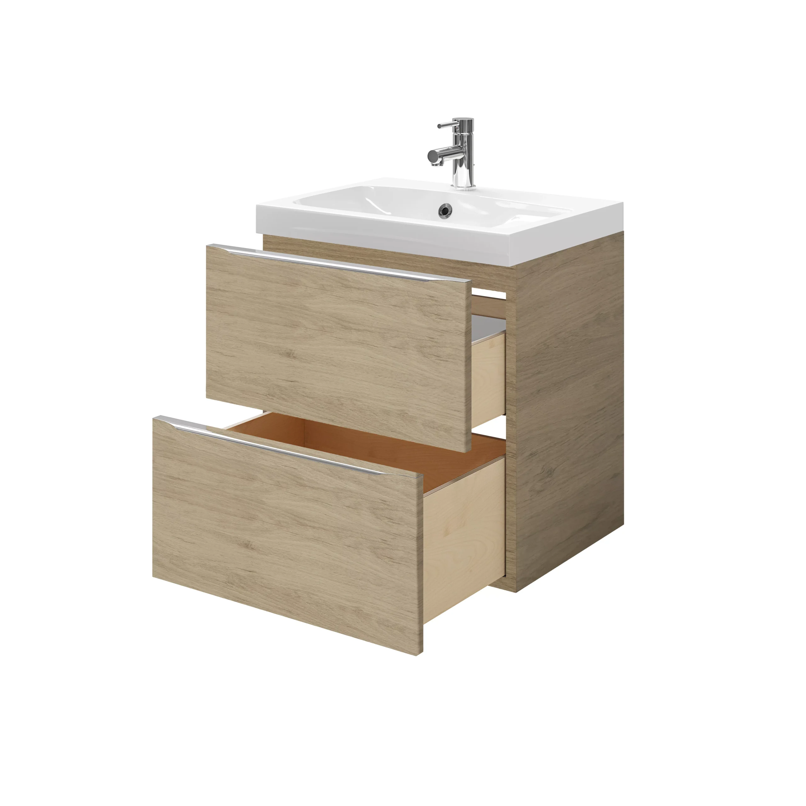 This Imandra two drawer oak effect vanity basin unit from GoodHome features soft close drawers and one divider per drawer, making it ideal for storing your bathroom essentials and keeping you bathroom tidy and clutter free. The Imandra range is a modular bathroom furniture solution that you can mix and match and fit from floor to ceiling in any space – no matter how awkward. This durable and easy to clean unit it is built to last – backed by a 10 year guarantee. This range has a variety of colours and sizes, so you will be able to find a colour to suit your own personal style.