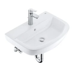 - Comes with 1x Grohe Bau Ceramic 550mm 1TH Basin – 39440000, 1x Start Edge Basin Mixer + Pop-Up Waste – 23342000, 1x Chrome P-Trap – 28947000, 2x Angled Shut-Off Valve – 22039000 and 1x Wall Fixing Kit