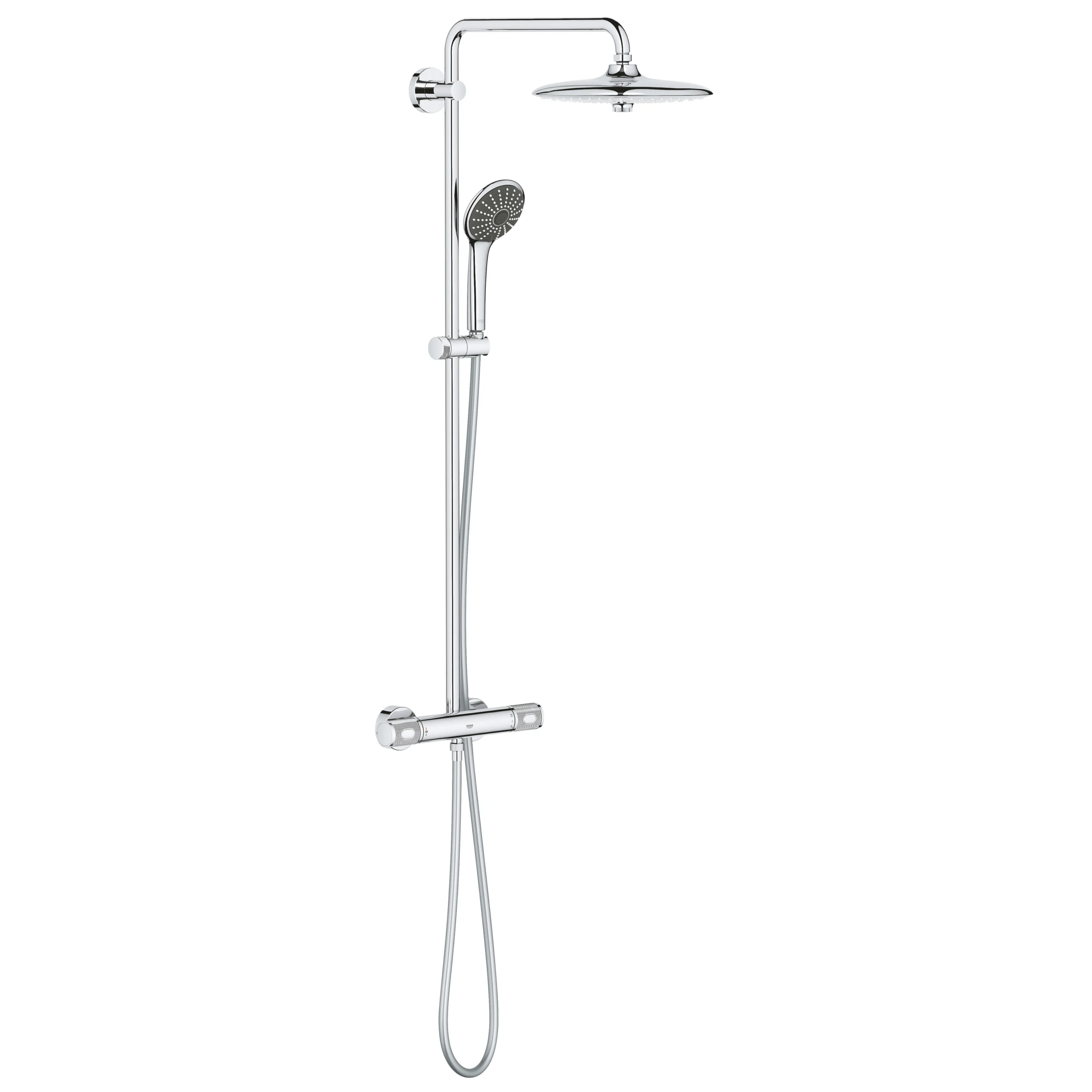 The Vitalio Joy 260 Thermostatic Shower System is a stylish, super safe and advanced system with extra safety features. Grohe CoolTouch means the entire thermostat housing never gets too hot, so there is no risk of burns. The arm of the head shower swivels to ensure you get the perfect angle, while the shower handset features Rain, Massage, SmartRain spray patterns.