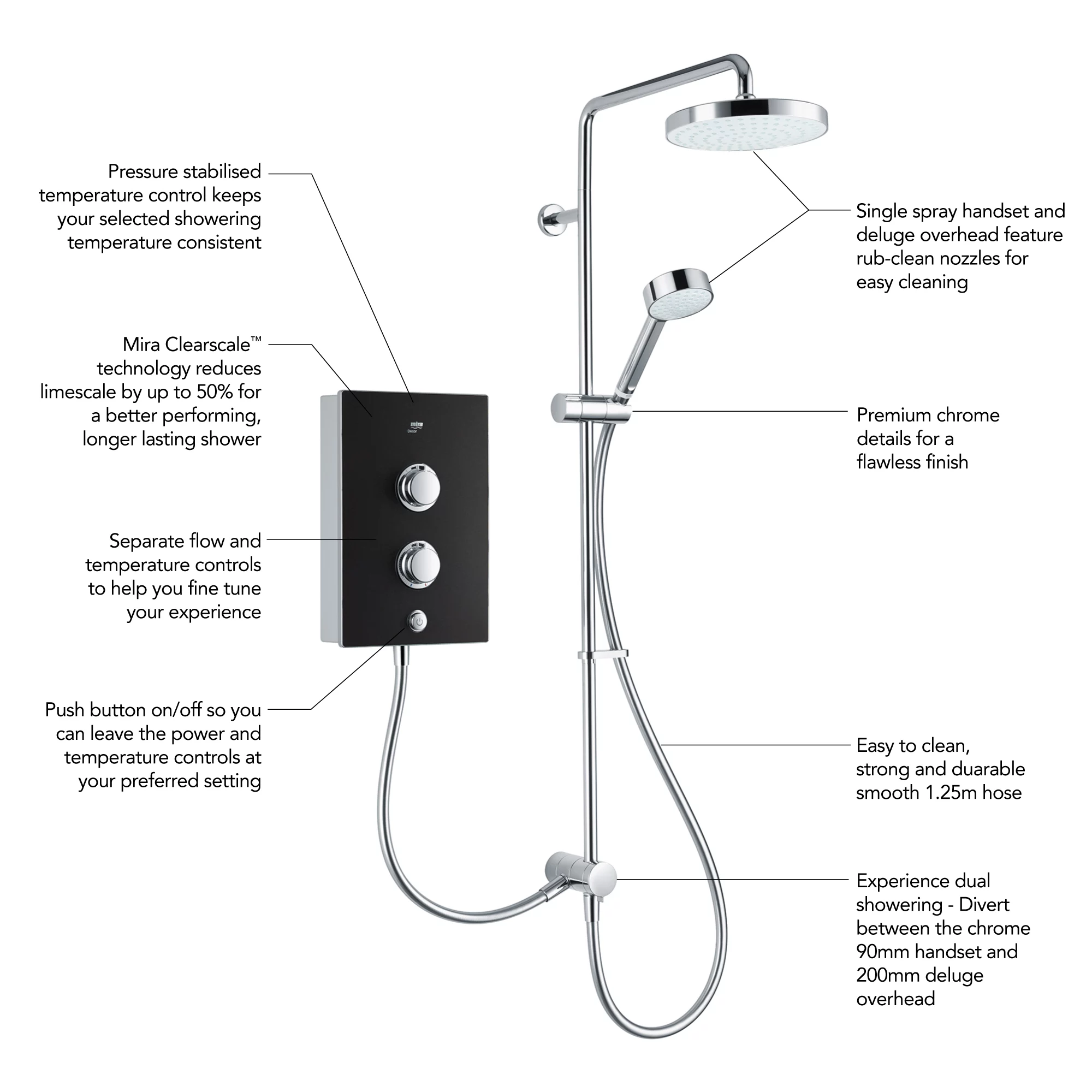 - Mira clearscaleâ„¢ technology reduces lime scale by up to 50% for a better performing, longer lasting shower