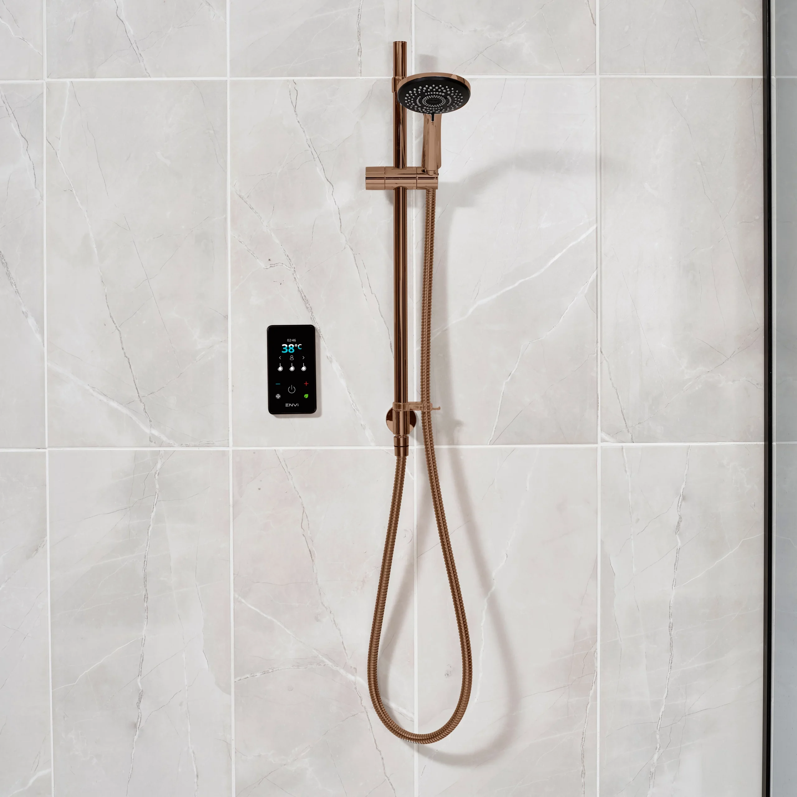 Discover the next generation of personalised electric showering with ENVi – choose from a pre-set programme or create your own shower profile, with six slots available, your whole family can save their own personal time and temperature settings. ENVi features full-colour digital display that provides feedback on individual shower use, including water and energy usage, plus cost info per shower. Not only is the ENVi range efficient and innovative its sleek, modern style is sure to upgrade your bathroom space, with multiple finishes and shower head types you are bound to find an ENVi that is suited to your home.