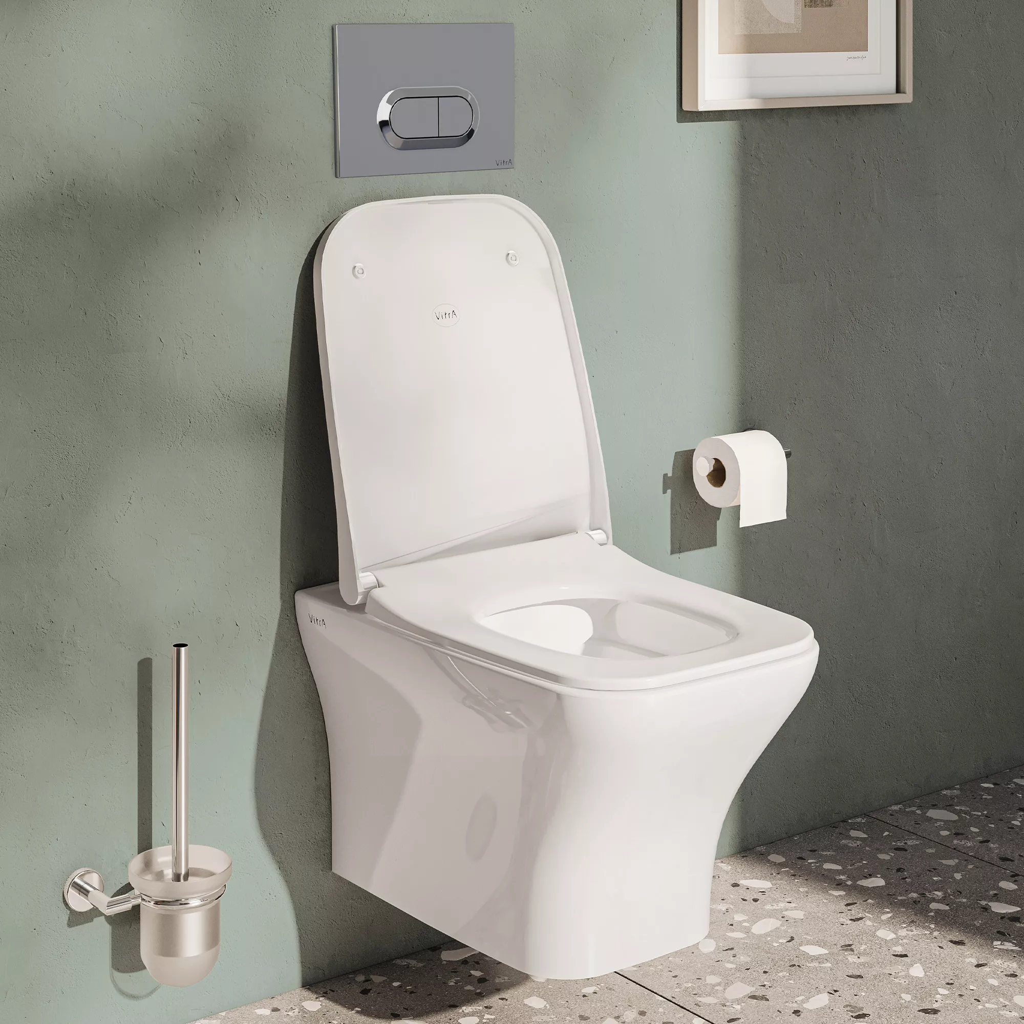 This wall-hung toilet with soft-close seat offers a contemporary square design and space-saving solution. Experience optimal comfort, effortless cleaning, and a clutter-free floor with this stylish and functional WC.